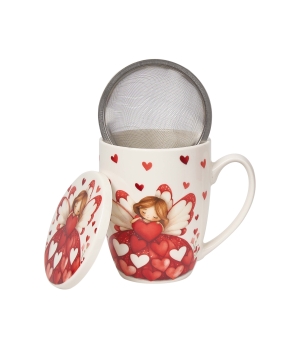 Kubek z zaparzaczem ANIOŁ wchodzący w skład linii SERCA, wykonany z porcelany New Bone China, charakteryzującej się elegancką i naturalną kremowo - białą barwą z delikatnym połyskiem a także wyjątkową wytrzymałością przy zachowaniu lekkości i delikatności.