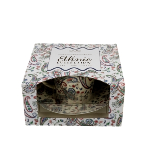 Filiżanka ze spodkiem LIBERTY wchodząca w skład linii ETHNIC, wykonana z porcelany New Bone China, charakteryzującej się elegancką i naturalną kremowo - białą barwą z delikatnym połyskiem a także wyjątkową wytrzymałością przy zachowaniu lekkości i delikatności.