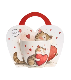 Kubek 460 ml w "koszyczku" KOT Z ZABAWKĄ wchodzący w skład serii SERCA, charakteryzuje się naturalnym kremowo-białym kolorem z delikatnym połyskiem oraz wyjątkową wytrzymałością i trwałością, zachowując lekkość i finezję.