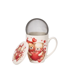 Kubek z zaparzaczem MISIE Z SERCAMI wchodzący w skład linii SERCA, wykonany z porcelany New Bone China, charakteryzującej się elegancką i naturalną kremowo - białą barwą z delikatnym połyskiem a także wyjątkową wytrzymałością przy zachowaniu lekkości i delikatności.