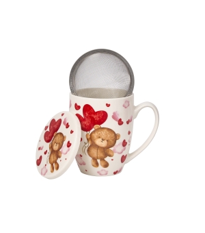 Kubek z zaparzaczem MIŚ Z BALONAMI wchodzący w skład linii SERCA, wykonany z porcelany New Bone China, charakteryzującej się elegancką i naturalną kremowo - białą barwą z delikatnym połyskiem a także wyjątkową wytrzymałością przy zachowaniu lekkości i delikatności.